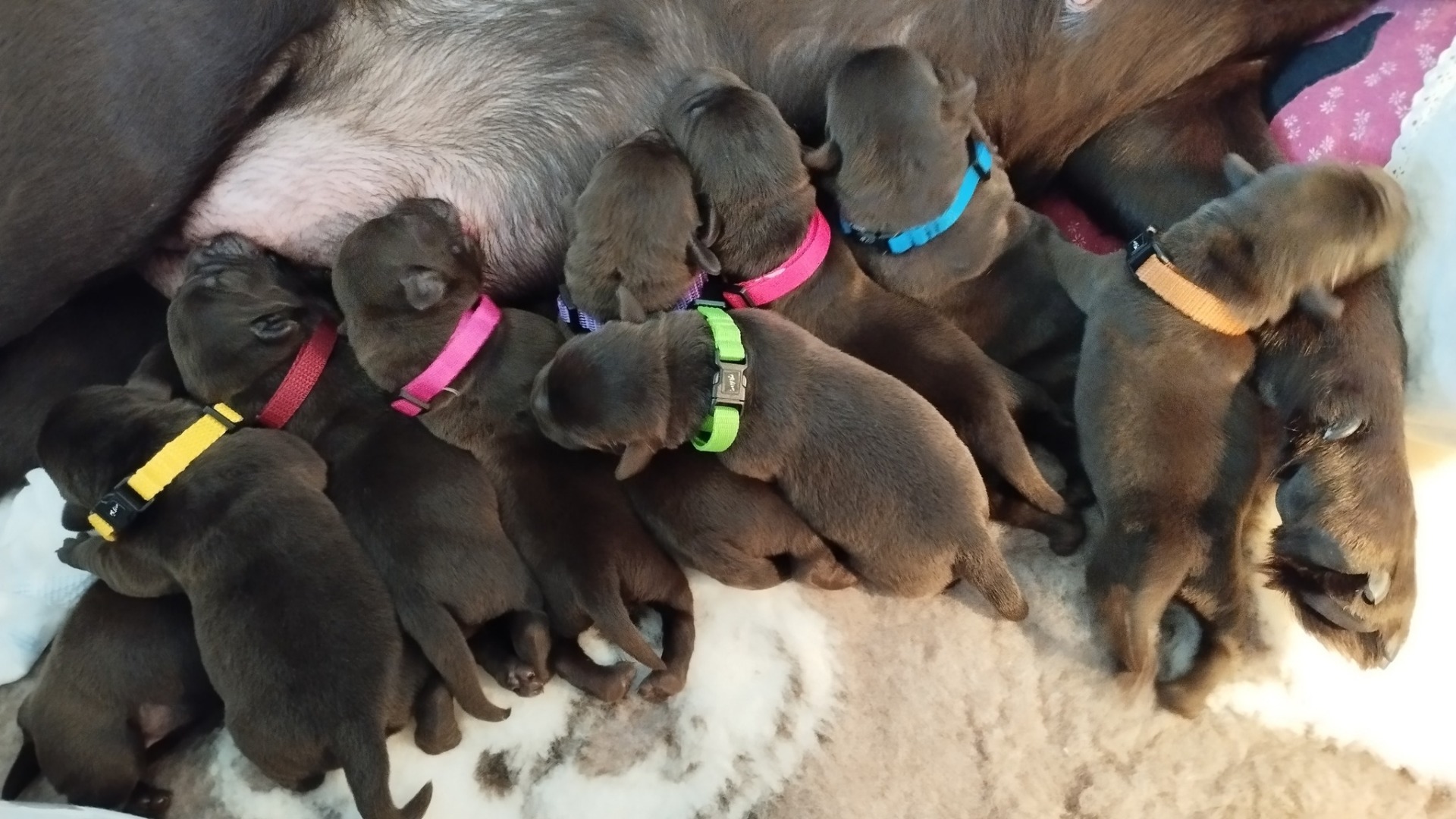 Všechna štěňátka krásně prospívají a dělají nám obrovskou radost. Porodní váhy: 305–370 g Aktuálně: 510–550 g Krmíme se poctivě každé 2 hodiny – a všichni mají pořádnou chuť k jídlu!